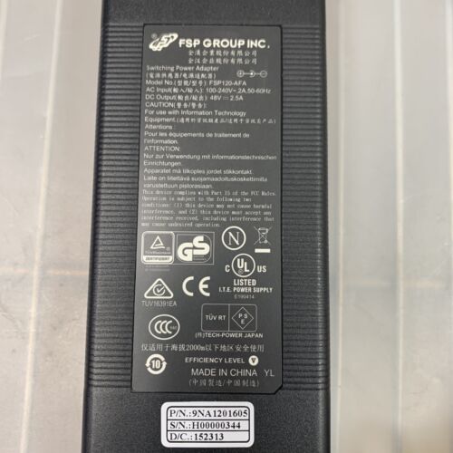 FSP FSP120-AFA AC Power Supply Adapter – 120W / 48V / 2.5A. Used working adapters. Outputs 48V / 2.5A P/N: 9NA1201605